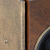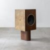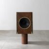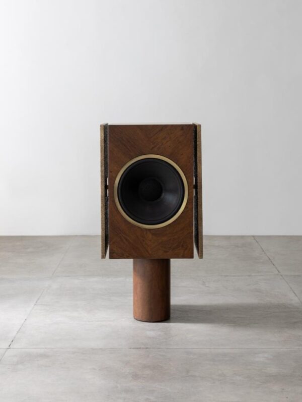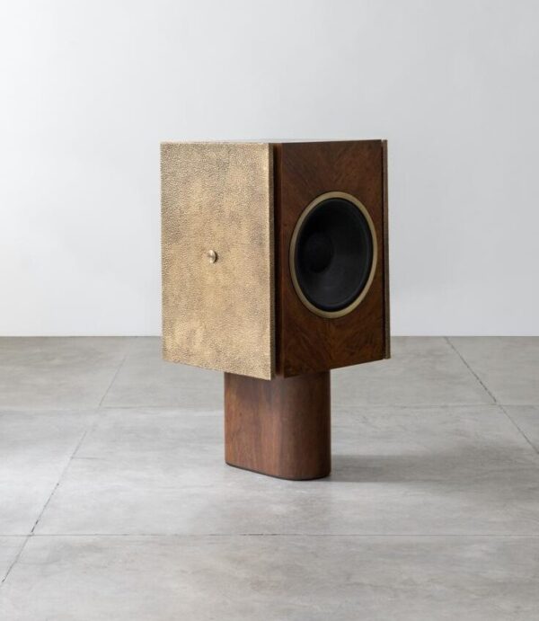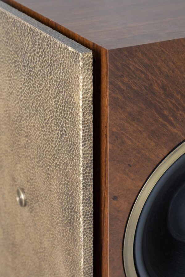 A caixa de som remete à força primordial do metal, com volumetria vertical que potencializa a performance sonora e marca presença no espaço. Entre design e escultura, evoca o glamour das décadas de 60 e 70, enquanto a madeira destaca a marchetaria e o desenho natural dos veios.