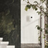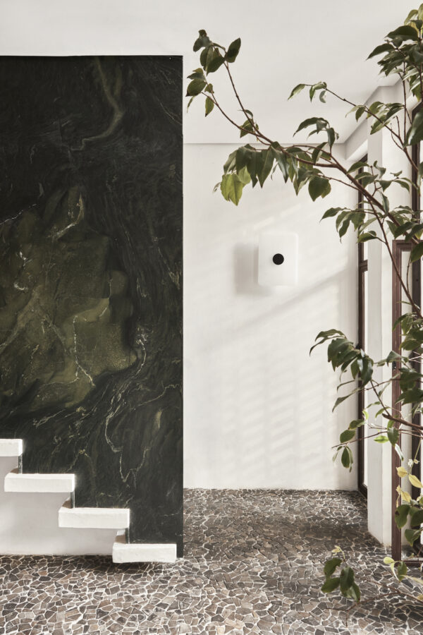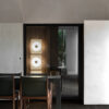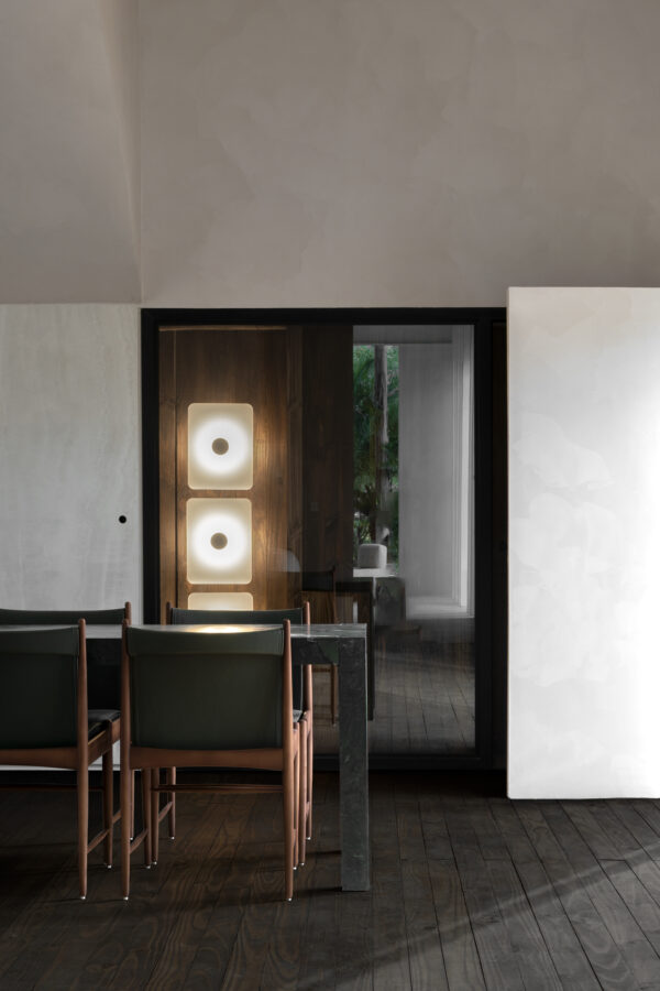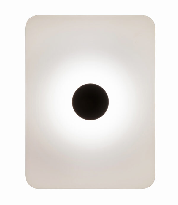 Arandela de geometria essencial, com placa difusora e elemento central em destaque.