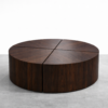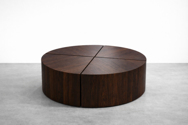 Quando reunidas, as fatias se recombinam em um único corpo, formando uma mesa de apoio central. O desenho propõe flexibilidade sem perder unidade, transformando a peça em um elemento funcional e adaptável, que responde às diferentes configurações do ambiente com fluidez.